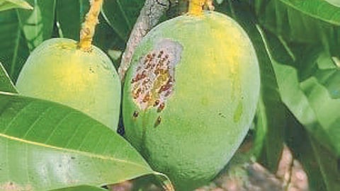 आंबा पिकांवर काही ठिकाणी फळे बाधित होण्यास सुरुवात झाली आहे. आंब्याला काळे डागदेखील पडत आहेत. या शिवाय थ्रीप्स, तुडतुड्यांचे प्रमाणदेखील वाढत आहे. त्यामुळे आंबा बागायतदारांमध्ये चिंतेचे वातावरण आहे.