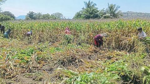 नाशिक : चालू सप्ताहात गुरुवारपर्यंत (ता. १३) पावसाने अनेक भागांना दणका दिला. त्यामुळे खरीप हंगामातील सोयाबीन, मका, बाजरीसह भाजीपाला या पिकांचे मोठे (Soybean Crop Damage) नुकसान झाले. आता शुक्रवार (ता. १४) नंतर पावसाने अनेक भागांत खंड दिल्यानंतर शनिवारी (ता. १५) निरभ्र वातावरण होऊन कडक ऊन पडले आहे. त्यामुळे पुन्हा एकदा शिवारात वाचलेली पिके शेताबाहेर काढण्याची (Crop Harvesting) लगबग सुरू झाली आहे. त्यामुळे शेतकरी पुन्हा एकदा कामात व्यग्र झाले आहेत; मात्र नुकसान अधिक असल्याने शेतकरी हवालदिल आहेत.