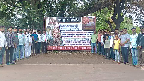 बागलाण तालुका शेतकरी संघटनेतर्फे फलक लावून सरकारचा जाहीर निषेध करण्यात आला. तालुकाध्यक्ष केशव सूर्यवंशी, वैभव अहिरे, भास्कर बागूल, भिका सूर्यवंशी, उमेश खैरनार, वसंत जाधव, नानाजी जाधव, ज्ञानेश्वर जाधव, घनश्याम जाधव, सोमनाथ जाधव, महेंद्र जाधव, रूपेश जाधव, रमेश जाधव, बाबूराव जाधव, त्र्यंबक जाधव, चेतन पवार, जगदीश आहिरे, विनोद जाधव, चेतन पवार, सुशांत जाधव, गौरव शेवाळे, शिवजी जाधव, कार्तिक जाधव, शरद जाधव आदी शेतकरी उपस्थित होते.