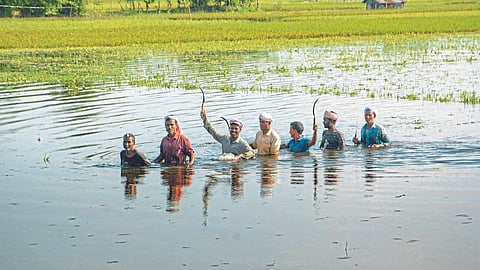 करीमगंज, आसाम (वृत्तसंस्था) : आसामचे मुख्यमंत्री डॉ. हिमंता बिस्वा सरमा यांनी सोमवारी (ता. २०) सांगितले, की राज्यातील नागाव आणि मोरीगाव जिल्ह्यातील २ हजारांहून अधिक गावे अद्याप पुराच्या पाण्याखाली आहेत. आसाम राज्य आपत्ती व्यवस्थापन प्राधिकरणाने (एएसडीएमए) सांगितले, की आसाममध्ये आलेल्या पुरामुळे १० जणांचा मृत्यू झाला आहे, तर ७ जण बेपत्ता आहेत. सध्याच्या पूर आणि भूस्खलनात गेल्या २४ तासांत १ लाख १३ हजार ४८५.३७ हेक्टरवरील पिकांचे नुकसान झाले असून, ३६४ घरांचे (१२६ पूर्ण आणि २३८ अंशतः नुकसान) नुकसान झाले आहे.