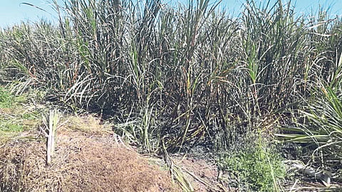Sugarcane Fire News अंबासन, ता. सटाणा : द्याने (ता. सटाणा) येथील उस उत्पादक (Sugarcane Farmer) शेतकरी सुरेखा भरत कापडणीस यांच्या गट क्र.१६० व गौरव भरत कापडणीस यांच्या गट क्र.१६२ या दहा एकरातील उसाच्या शेतात (Sugarcane Fire) शनिवारी (ता. ११) जीर्ण झालेली उच्च दाबाची वीजवाहक तारा तुटून पडल्याने चार एकरावरील ऊस जळून खाक झाला.