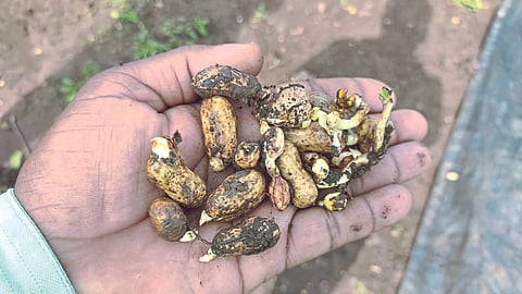 जानेवारी महिन्यात लागवड केलेले हे पीक आता काढणीला आले आहे. काही शेतकऱ्यांनी काढणी सुरू केली. दरम्यान, गेल्या आठवड्यात या भागात जोरदार पाऊस झाल्याने भुईमुगाला कोंब फुटले.