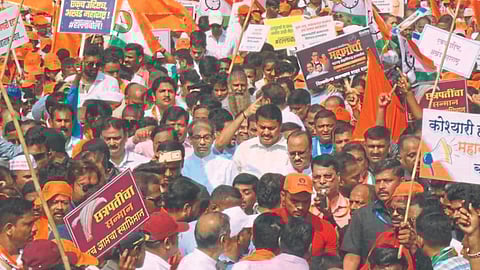 ‘‘आजच्या महामोर्चाने महाराष्ट्रद्वेष्ट्यांच्या मनात धडकी भरवली आहे. हे सरकार आल्यापासून राज्यातील महापुरुषांचा अवमान केला जात आहे. यापुढे असे घडू नये यासाठी राज्य सरकारने कडक कायदा करावा, त्यासाठी अधिवेशनात विधेयक आणावे,’’ अशी मागणी विरोधी पक्षनेते अजित पवार यांनी केली. ‘‘राज्य सरकार फेब्रुवारीपर्यंत राहत नाही,’’ असे भाकीत शिवसेना खासदार संजय राऊत यांनी केले.