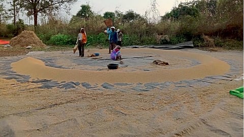 विक्रमगड : ढवळ्या-पवळ्यांना एकत्र करून पुन्हा एकदा शेतावरील खळ्यांत भात (Paddy) झोडणीने वेग घेतला आहे. सद्यस्थितीत विक्रमगड तालुक्यातील बहुतेक भातकापणीची (Paddy Harvesting) कामे आटोपली आहेत. त्यामुळे आता शेतकरी भात झोडणीच्या कामांना लागला आहे.