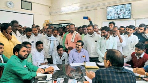 या ठिकाणावरूनच वरिष्ठ अधिकाऱ्यांना विचारणा करण्यात आली. दुपारी चार वाजेपर्यंत ठिय्या कायम होता. कुठलेही समाधानकारक उत्तर न मिळाल्याने कार्यालय परिसरात तणाव सदृश परिस्थिती तयार झाली होती.