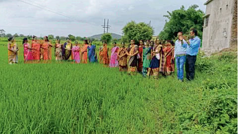 भात विषयावरील या शेतीशाळेच्या सुरुवातीला सहभागी महिलांनी प्रतिज्ञा म्हटली. त्यानंतर फुटवे येण्याच्या अवस्था तसेच खत व्यवस्थापनातील नत्राची दुसरी मात्रा यावर चर्चा करण्यात आली. भात पिकावर सद्यःस्थितीत येणाऱ्या किडरोगांवरही यावेळी मंथन झाले.