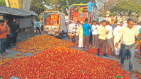 त्यामुळे खर्चही वसूल होत नसल्याने शेतकऱ्यांनी नाशिक बाजार समितीच्या पेठ रोडवरील आवाराच्या प्रवेशद्वारावरच टोमॅटो ओतून संताप व्यक्त केला. त्यामुळे येथे लाल चिखल झाल्याचे पाहायला मिळाले.