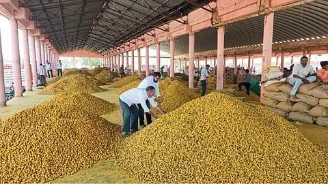 Sangli News : अपुऱ्या पावसाचा आणि पाण्याच्या कमतरतेचा फटका हळद उत्पादनाला बसला आहे. देशात हळदीचे अंदाजे ५५ ते ६० लाख पोत्यांचे (एक पोते ५० किलोचे) उत्पादन झाले आहे. गतवर्षीच्या तुलनेत २५ ते ३० लाख पोत्यांनी उत्पादनात घट झाली आहे. यावर्षीचा हळद विक्रीचा हंगाम अंतिम टप्प्यात असून, देशातून सुमारे ७० टक्के हळदीची विक्री झाली आहे, असे हळद उद्योगातील जाणकारांनी सांगितले.
