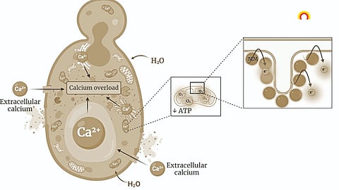 त्याच्या कामामध्ये बाधा आणल्यामुळे पेशीतील पाणी आणि कॅल्शिअमसारख्या आयनमध्ये असंतुलन निर्माण होते. परिणामी, ती पेशी पूर्णपणे कोलमडून पडते.