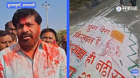 Farmers Protest Against Government : राज्यभर होळीचा सण मोठ्या उत्साहात साजरा केला जात आहे. दरम्यान, माजी राज्यमंत्री बच्चू कडू यांनी वेगळ्या पद्धतीने धुलीवंदन साजरे केले आहे. अमरावती जिल्ह्यातील कुरळपूर्णा येथे बच्चू कडूंनी तब्बल ५ किमी रस्ते रंगवत शेतकऱ्यांच्या अनेक मागण्या करण्याचे आवाहन सरकारला केले आहे. याचबरोबर कडू यांनी सरकारवर जोरदार टीकाही केली.