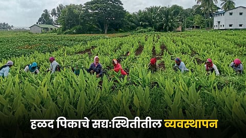 Turmeric Farming Management : सध्या हळद लागवड होऊन १२० दिवसांचा कालावधी पूर्ण झाला आहे. या काळात पिकाची शाकीय वाढ पूर्ण होते. शाकीय वाढीच्या अवस्थेमध्ये हळदीला फुटवे येतात. तसेच हळद पिकाच्या एकूण नऊ महिन्यांच्या कालावधीमध्ये येणाऱ्या एकूण पानांची संख्या आणि उंची या अवस्थेमध्ये निश्चित होत असते. पावसाळी हंगामात हळदीच्या खोडांची तसेच फुटव्यांची भरपूर वाढ होते. या काळात वातावरणात २५ ते ३५ अंश सेल्सिअस तापमान असते, ते शाकीय वाढीसाठी पूरक ठरते.