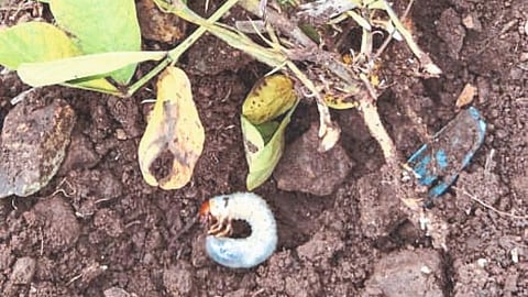 भुईमुगाचे क्षेत्रातील जमिनीखाली हुमणीचा प्रादुर्भाव झाला आहे. त्यामुळे हातातोंडाशी आलेले पीक वाया जाणार असल्याने हाती पीक येणं कठीण झालं आहे असे शेतकऱ्यांचे म्हणणे आहे.