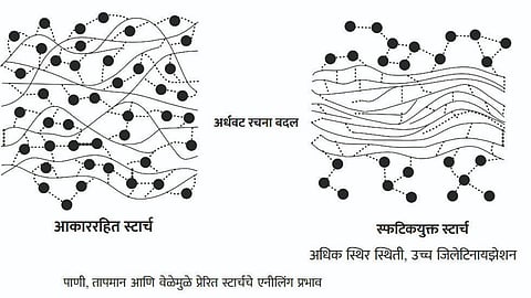 तसेच त्याचे कार्यात्मक गुणधर्मही बदलू शकतात. जेव्हा अन्नपदार्थातील स्फटिकमय स्टार्चचे आकाररहित स्टार्चमध्ये रूपांतर होते, तेव्हा अन्नपदार्थातील स्टार्च रेणूमध्ये ध्रुवीय जागा विकसित होऊन पाण्याच्या रेणूंसह हायड्रोजन बंध तयार होतात.