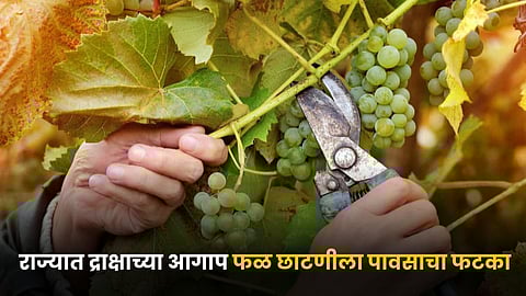 आगाप फळ छाटणी उरकल्यानंतर अंदाजे ३ लाख ८२ हजार ५०० एकरांवरील द्राक्षाची फळ छाटणी सप्टेंबर महिन्यापासून सुरुवात होते. मात्र यंदा राज्यभरात अतिवृष्टी आणि सततच्या पावसामुळे शेतकऱ्यांनी फळ छाटणी थांबवली आहे. वास्तविक पाहता वीस दिवस फळ छाटणी लांबणीवर पडली आहे. परंतु या पावसामुळे पानगळ झाली असल्याने शेतकऱ्यांना फळ छाटणी करण्याशिवाय दुसरा पर्याय नाही. शेतकऱ्यांनी गेल्या आठवड्यापासून फळ छाटणीला सुरुवात केली आहे. आजअखेर सुमारे १५ ते २० टक्क्यांपर्यंत फळ छाटणी झाली आहे.
