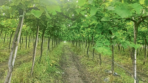 यंदा नोव्हेंबरमध्ये मॉन्सूनोत्तर पाऊस व गारपीट झाल्याने सिंदखेडराजा तालुक्यातील लेंडी पिंपळगाव येथील मधुकर गायके यांच्या एक हेक्टरमधील द्राक्ष बागेचे अतोनात नुकसान झाले. अर्ध्या बागेत एकही घड शिल्लक नसल्याची स्थिती आहे. शनिवारी (ता.१३) त्यांच्या बागेची पाहणी केली असता ही वस्तुस्थिती दिसून आली. गायके यांनी पाच वर्षांपूर्वी एक हेक्टरमध्ये द्राक्ष बाग लावली. माणिकचमन व सोनाका जातीची या वेली आहेत.