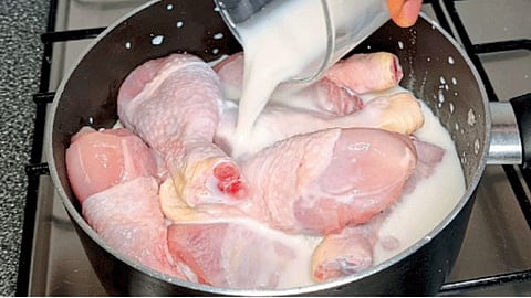 क) जास्त आम्लयुक्त पदार्थ : टोमॅटो आणि लिंबूवर्गीय फळे यांसारखे आम्ल प्रमाण जास्त असलेले पदार्थ कोंबडीचे मांस कडक आणि चिघळू शकतात.