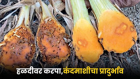 सध्या हळद शाखा वाढीच्या काळात पीक असून कंदही वाढीच्या अवस्थेत आहे. जून, जुलै आणि ऑगस्ट महिन्यांत सलग पाऊस पडला. शेतात पाणी साचले. पाणी निचरा झाला नाही. परिणामी, याचा फटका हळदीवर झाला. सध्या पाऊस आणि धुके यामुळे करपा रोगाचा प्रादुर्भाव होऊ लागला आहे. करपा रोगामुळे पानांची संख्या कमी होते.