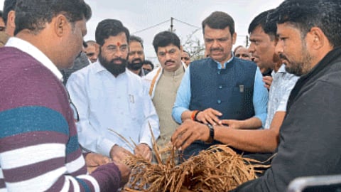 राज्यातील दुष्काळ, अवकाळी पाऊस, गारपीट, ‘मिगजौम’मुळे शेतकरी उद्धवस्थ झाला असताना मंत्री शेतकऱ्यांच्या बांधावर फिरकले नाहीत तर मुख्यमंत्री प्रचारात व्यस्त होते, अशा शब्दात विरोधी पक्षनेते विजय वडेट्टीवार यांनी विधानसभेत सत्ताधाऱ्यांचे वाभाडे काढताच संवेदनशील मुख्यमंत्री शिंदे विधिमंडळाचे कामकाज संपताच नागपूर जिल्ह्यातील मौदा तालुक्यातील तारसा, निमखेडा, पारशिवणी या गावांतील शेतकऱ्यांच्या बांधावर पोहचले.