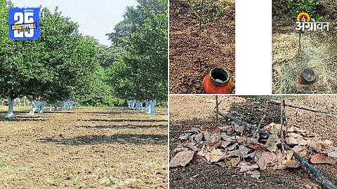 ९. ओलिताच्या पाण्याचे खूप दुर्भिक्ष असल्यास विकसित झाडाच्या विरुद्ध दिशेला मुख्य खोडापासून ४ ते ५ फूट दूर अंतरावर २ ते ३ फूट खोल व १ फूट रुंद व्यासाचे खड्डे करून घ्यावते. त्यामध्ये पाणी भरावे. यामुळे उपलब्ध पाण्याचे कार्यक्षम वापर होऊन फळझाडांचे संरक्षण होते.