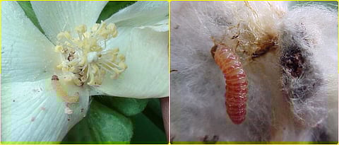 Akola News : अकोला जिल्ह्यात कापूस पट्ट्यात गुलाबी बोंड अळीचा अखेर शिरकाव झाला असून, तेल्हारा तालुक्यात तळेगाव परिसरात अळीने केलेले नुकसान समोर आले आहे. शेतकरी अळीच्या निर्मूलनासाठी कीडनाशकाच्या फवारणीला लागला आहे.