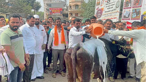 Solapur News : माढ्यात दूध उत्पादकांनी एकत्रित येऊन दूध दरवाढीच्या मागणीसाठी गाईला दुधाने अंघोळ घालून राज्य सरकारचा निषेध नोंदविला. तसेच तुरीचा विमा अग्रिममध्ये समावेश करावा, अशी मागणी करत बुधवारी (ता. २९) रास्ता रोको आंदोलन केले.