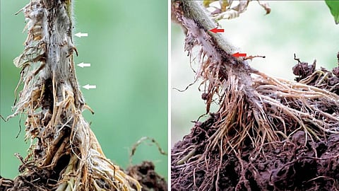 बहुतांश वेळा प्रादुर्भावामुळे खोडाला मुळे फुटलेली दिसतात. त्यावर पांढरट वाढ दिसून येते.