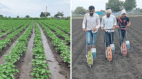 पूर्वी ट्रॅक्टरचलित यंत्राव्दारे दोन ओळींत १८ इंच ठेवून सोयाबीनची लावणी व्हायची. बियाणे वापर एकरी ३० किलो होता. पुढे ट्रॅक्टरचलित रुंद वरंबा सरी (बीबीएफ) यंत्र पद्धतीने पेरणी केली. बियाणे वापर एकरी २२ किलोपर्यंत आला. या पध्दतीचे फायदे मिळून उत्पादन एकरी १० क्विंटलपर्यंत मिळू लागले. मागील दोन वर्षापासून मानवचलित टोकण यंत्राचा वापर खरिपात सोयाबीन व रब्बीत हरभऱ्यात सुरू केला. दोन बेडमधील अंतर अडीच फूट, उंची सुमारे एक फूट तर रुंदी १८ इंच असते. दोन बियाणे वा झाडांमध्ये