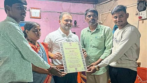 लोकसभेतील विरोधी पक्षनेते राहुल गांधी यांनी शनिवारी (ता. ५) विविध कार्यक्रमांच्या निमित्ताने कोल्हापूरला भेट दिली. विमानतळावरून कार्यक्रमस्थळी येतानाच त्यांची गाडी उचगाव दलित वस्तीत वळाली. त्यांच्या भेटीची कुणालाच कल्पना नव्हती. शेतकरी कुटुंबातील असलेले व सध्या टेम्पोचालक असणारे अजित सनदे यांच्या घरासमोर गाड्यांचा ताफा येऊन थांबला.