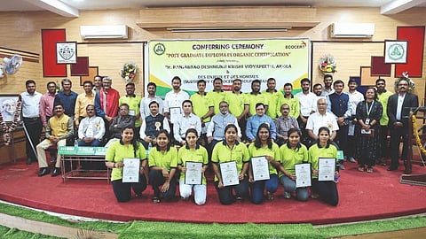 PDKV, Akola अकोला ः डॉ. पंजाबराव देशमुख कृषी विद्यापीठ आणि इकोसर्ट (फ्रान्स) यांच्या संयुक्त विद्यमाने आंतरराष्ट्रीय सेंद्रिय पदव्युत्तर पदविका अभ्यासक्रम सुरू करण्यात आलेला असून, या अभ्यासक्रमाची पहिली तुकडी बाहेर निघाली आहे. या तुकडीतील विद्यार्थ्यांना पदविका प्रमाणपत्राचे वितरण मान्यवरांच्या हस्ते करण्यात आले.