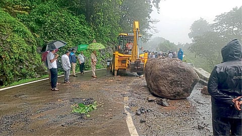 Sindhudurg News : जिल्ह्यात पावसाचा जोर वाढला असून पडझडीचे प्रकार सुरू आहेत. बुधवारी (ता. १७) पहाटे आंबोली (ता. सावंतवाडी) घाटरस्त्यावर दरड कोसळल्याने या मार्गावरील वाहतूक ठप्प झाली. तर भुईबावडा (ता. वैभववाडी) घाटरस्त्यातील संरक्षक भिंत कोसळली असून रस्त्याला भेगा पडल्या आहेत. दरम्यान सकाळपासून जिल्ह्यात सर्व पावसाच्या सरीवर सरी कोसळत आहेत.