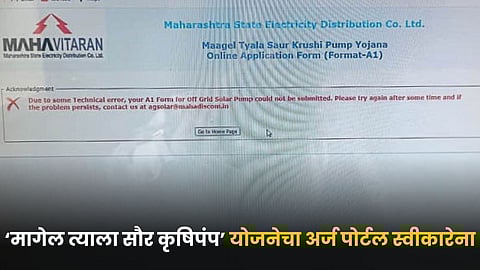 शासनाकडून सौरपंपासाठी महावितरणमार्फत ‘मागेल त्याला सौर कृषिपंप’ योजना राबवली जात आहे. यासाठी ज्या वेबसाइटवर अर्ज घेतले जातात, ती साइट काम करीत नसल्याने शेतकरी त्रासले आहेत. या साइटवर शेतकऱ्यांना सातत्याने तांत्रिक ‘एरर’ (अडचण) असल्याचा मेसेज मिळत राहतो.