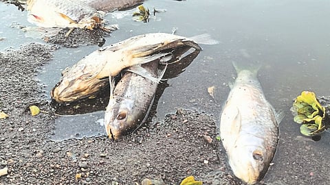 धरणातून पाणी सोडलेले नाही. त्यामुळे नदी प्रवाहित नाही. परिणामी, नदीपात्रात दूषित पाणी मोठ्या प्रमाणात मिसळले आहे. त्यामुळे बंधाऱ्यातील पाणी प्रदूषित झाले आहे. पाण्यातील ऑक्सिजनची मात्रा कमी झाल्यामुळे मासे तडफडून मृत झाले.