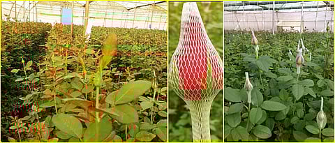 हरितगृहामध्ये गुलाब लागवड केल्यानंतर त्यांची संरचना (स्ट्रक्चर) तयार करणे गरजेचे असते. त्यावरच पुढील पाच वर्षांतील उत्पादनाचे गणित बसवता येते. त्यासाठी खत, पाणी व्यवस्थापनासाठी मशागतीच्या विविध पद्धतींचा योग्य अवलंब करावा. लागवडीनंतर सुरुवातीचे १५ ते २० दिवस होजपाइपला झारी लावून हलके पाणी द्यावे. यामुळे सुरुवातीच्या काळात आवश्यक असलेली आर्द्रता हरितगृहामध्ये तयार करणे सोपे पडते. यामुळे मुळांची व कलमांची वाढ चांगल्या प्रकारे होते. त्यानंतर पुढील काळात हरितगृहामध्ये गुलाबाला ठिबक सिंचनाद्वारे पाणी दिले जाते. त्यामुळे रोपांना अचूक तेवढे पाणी व खते देता येतात. पाण्याचे प्रमाण हे तापमान, आर्द्रता व सूर्यप्रकाश यावर अवलंबून असते. पाण्याचा सामू ६.५ ते ७ दरम्यान असावा. २ ते २.५ लिटर पाणी प्रति चौ.मी. प्रति दिवस द्यावे. उष्ण व कोरड्या हवामानाच्या काळात पॉलिहाउसमधील तापमान कमी करण्यासाठी मिस्टर्स व फॉगर यंत्रणा दर ठरावीक काळानंतर सुरू करावी. खत व्यवस्थापन हरितगृहात गुलाबाची लागवड आणि त्याला लागणारी खते यांचा सतत अभ्यास सुरू असतो. झाडांची वाढीव संख्या, झाडांची सतत होणारी वाढ, उंचावलेली गुणवत्ता आणि अधिक उत्पादन यासाठी गुलाब झाडास नवीन लागवडीनंतर २१ दिवसांनी दररोज खते दिली जातात. त्याचे प्रति चौरस मीटर प्रमाण साधारणपणे पुढीलप्रमाणे असते.