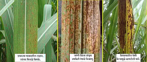 बुरशीचा जीवनक्रम व रोगाचा प्रसार उसाच्या पानावर दवाच्या स्वरूपातील असलेले पाणी प्रामुख्याने रोगवाढीसाठी महत्त्वाचा व अनुकूल घटक आहे. पानावर ओलसरपणा असताना बिजाणू रुजून बुरशी तयार होते. ही बुरशी पानांच्या आंतरभागात प्रवेश करून रोगनिर्मिती करते. पानामध्ये रोगनिर्मिती प्रक्रिया सुरू झाल्यापासून ३ ते ४ दिवसांत पानावर लहान, लांबट आकारांचे पिवळे ठिपके दिसतात. दोन आठवड्यांत नारंगी / तांबूस तपकिरी रंगाचे बिजाणू बाहेर पडतात. रोगाचा जीवनक्रम १० ते १२ दिवस इतक्या कमी कालावधीत पूर्ण होतो. प्रामुख्याने या रोगाचा दुय्यम प्रसार हवेमार्फत व पाण्यामार्फत होतो. या रोगाचा प्रसार बेण्यामार्फत अगदी कमी प्रमाणात होतो. संपर्क ः डॉ. भरत रासकर, ९९६०८०२०२८ (मध्यवर्ती ऊस संशोधन केंद्र, पाडेगाव, ता. फलटण, जि. सातारा)