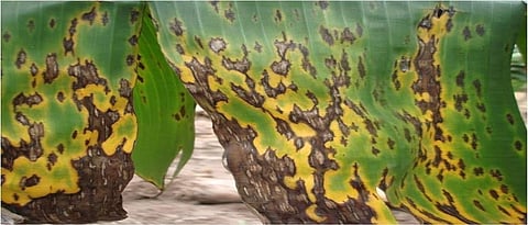 करपा रोगनियंत्रण हा रोग सरकोस्पोरा मुसी बुरशीमुळे होतो. रोगाचे प्रमुख लक्षण म्हणजे केळीच्या खालील ४ ते ५ पानांवर सुरुवातीला लहान-लहान पिवळसर लंबगोलाकार ठिपके पडतात. हे ठिपके मोठे होऊन आतील भाग तपकिरी काळपट रंगाचा होतो. नियंत्रण ः फवारणी प्रति लिटर पाणी प्रोपीकोनॅझोल (२५ ईसी) १ मिलि किंवा कार्बेन्डाझिम (५० डब्ल्यूपी) १ ग्रॅम द्रावणात १ मिलि स्टिकर मिसळावा. १५ दिवसांच्या अंतराने दुसरी फवारणी करावी.