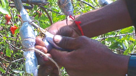 - गुटी बांधण्यासाठी पेन्सिलच्या आकाराची काडी निवडावी. साधारण एक सेंमी आकाराची गोलाकार साल काढावी. त्याभोवती पाण्यात ओले केलेले शेवाळ (ग्रीन स्पगनम मॉस) पुर्णपणे घट्ट बांधून शेवाळाच्या वर पारदर्शक प्लॅस्टीक गुंडाळून सुतळीच्या सहाय्याने हवा शिरणार नाही अशा पद्धतीने बांधावे.