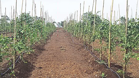 या बागेत काडी परिपक्वतेचा कालावधी सुरू झाला असावा. या वेळी वेलीची वाढ नियंत्रणात असणे गरजेचे असते. असे असल्यास काडी तळापासून वरपर्यंत शक्य तितक्या लवकर परिपक्व होईल. परिपक्व काडी तपासून पाहायची झाल्यास तपकिरी ते दुधाळ या रंगाच्या मध्यभागी काडीवर काप घ्यावा. या काडीमधील पिथ जर पांढरा ते तपकिरी रंगाकडे वळत असल्यास काडी परिपक्व होऊ लागली आहे, असे समजावे. सध्याच्या वातावरणाचा विचार करता वेलीच्या वाढीस पोषक वातावरण आहे. यामुळे फुटीचा शेंडा जोमात वाढेल, त्यामुळे काडीची परिपक्वता लांबणीवर जाण्याची शक्यता जास्त असेल. या वेळी प्रत्येक बागेत जमीन वाफसा स्थितीत नक्कीच असेल. अशा जमिनीत मुळांची वाढ व्यवस्थित होऊन जास्तीत जास्त पांढरी मुळे तयार झालेली असतील.