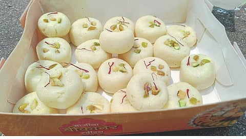 ३) मिश्रण एकजीव झाल्यावर त्याला एका थाळीत काढून थंड होऊ द्यावे. मिश्रण थंड आणि स्थिर झाल्यानंतर तळहाताच्या साह्याने २० ते २५ ग्रॅमचे गोळे तयार करून पेढे तयार करावेत.