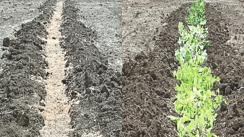 ४) दोन ओळींच्या मधील प्रत्येक चरांमध्ये बागेतील तणांचे अवशेष, काडी कचरा व शेतातील शिल्लक राहणारे सेंद्रिय अवशेष, धुऱ्यावरील सुबाभूळ, गिरिपुष्प, शेवगा यांसारख्या वारा प्रतिबंधक झाडांच्या कोवळ्या फांद्या इ. भरून घ्याव्यात.