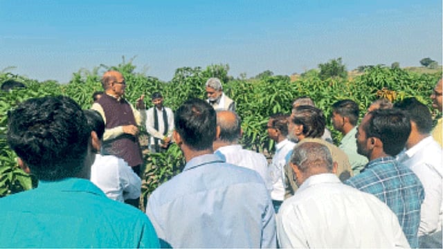 सिल्लोड तालुक्यातील मुखपाठ येथील अशोक सूर्यवंशी यांच्या आधुनिक अशा अति घन लागवड पद्धतीने उभारलेल्या अंबाबागेत मोहोर संरक्षणाविषयी मार्गदर्शन करीत होते. डॉ कापसे म्हणाले, की यावर्षी पाऊस भरपूर झालेला आहे. शेतकऱ्यांनी कल्टार सुद्धा वेळेवर दिलेले आहे. पाऊस जरी उशिरापर्यंत झाला असला तरीही ऑक्टोबर मध्ये नवती आली नाही,
