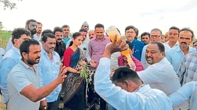 Nashik News : कांद्याचे नुकसान झाले...सगळं वाटोळं झालं, असं म्हणत तळेगाव रोही (ता. चांदवड) येथील शेतकऱ्याने केंद्रीय आरोग्य राज्यमंत्री डॉ. भारती पवार यांच्यासमोरच अंगावर पेट्रोल ओतून आत्मदहनाचा प्रयत्न शुक्रवारी (ता. १) केला. अचानक झालेल्या या प्रकाराने डॉ. पवारही अचंबित झाल्या. यावेळी त्यांनी शेतकऱ्यांना दिलासा देत शांत करण्याचा प्रयत्न केला.