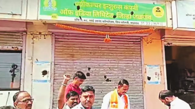 शिवकॉलनी बस थांब्याजवळ पीक विमा कंपनीचे अधिकारी नसल्याने त्यांच्या कार्यालयाला शेण मारण्यात आले. पीक विम्याचे पैसे मिळाले नसल्याने शेतकरी आता हवालदिल झाला आहे, हे सरकार व्यापारी लोकांचे आहे यांना शेतकरी प्रश्नांविषयी काहीही देणे घेणे नाही, अशा शब्दात नाराजी व्यक्त करण्यात आली.