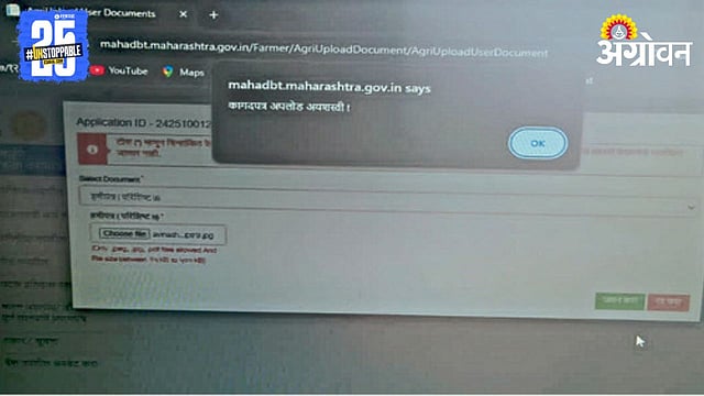दरम्यान, मागील दोन दिवसांपासून महाडीबीटी पोर्टलवर कागदत्रे अपलोड होत नसल्याने शेतकरी वैतागून गेले आहेत. कागदपत्र अपलोड करण्याचा प्रयत्न करताच कागदपत्र अपलोड अयशस्वी असा संदेश येत आहे. शेतकरी वारंवार सीएससी केंद्रांवर हेलपाटे मारून त्रासून जात असल्याची स्थिती आहे.