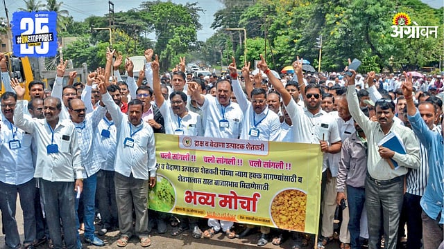 बेकायदेशीर बेदाणा आयातीला आळा घाला, यासह विविध मागण्यांसाठी द्राक्ष व बेदाणा उत्पादक शेतकऱ्यांनी बुधवारी (ता. ६) जिल्हाधिकारी कार्यालयावर मोर्चा काढला. मोर्चाचा प्रारंभ विश्रामबाग चौकातील क्रांतिसिंह नाना पाटील यांच्या पुतळ्यापासून झाला. ‘एक है तो सेफ है, बेकायदेशीर बेदाण्यावर बंदी घाला,’ अशा घोषणा शेतकऱ्यांनी दिल्या.