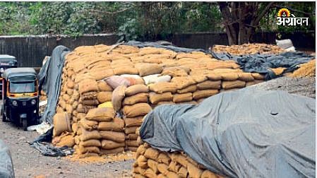पनवेल सहकारी भात खरेदी केंद्रावर प्रमाणापेक्षा अधिक भात खरेदी केल्यामुळे बहुतांश भाताच्या गोण्या गोदामाबाहेर ठेवण्याची वेळ आली.