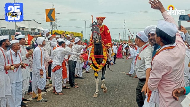 Solapur News: रांगोळीच्या पायघड्या अन् जेसीबीतून पुष्पवृष्टी करून संत तुकाराम महाराजांच्या पालखी सोहळ्याचे माळीनगर येथे बुधवारी (ता. २) मोठ्या उत्साहात स्वागत करण्यात आले. या सोहळ्याच्या वाटचालीतील पहिले उभे रिंगण सकाळच्या रम्य प्रहरी आल्हाददायी वातावरणात येथे रंगले.