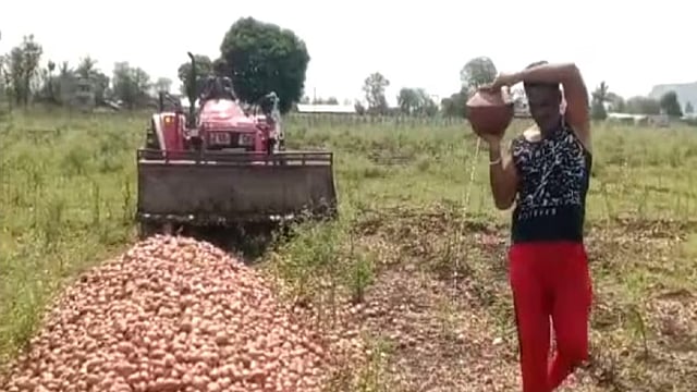 योगेश सोनावणे यांनी शेतात काढणी करून कांदा साठवला होता. परंतु भाव मिळत नसल्याने निराश होऊन सोनावणे यांनी ट्रॅक्टरच्या मदतीने कांदा पसरवला. तसेच अंत्यविधी करून कांदा नष्ट केला.