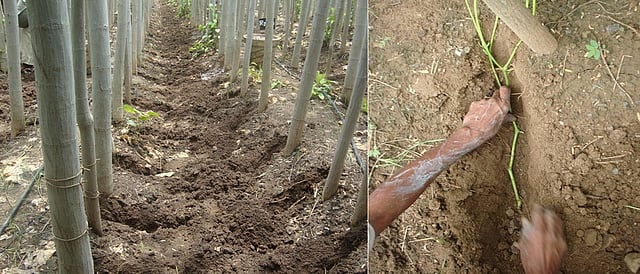 पाणी व्यवस्थापन वाफा पद्धत : या पद्धतीने जमिनीच्या मगदुराप्रमाणे पावसाळ्यात गरज भासल्यास, हिवाळ्यात १० दिवसांच्या अंतराने तर उन्हाळ्यात ५ ते ६ दिवसाच्या अंतराने पाणी द्यावे. या पद्धतीत वाफ्यांना भरपूर पाणी दिले जाते. पुष्कळदा वेलीच्या गरजेपेक्षा ते जास्त होते. त्यामुळे पाणी तर वाया जातेच तसेच मुळ कुजव्या व इतर रोगांचे प्रमाण वाढते. परिणामी, चांगली पाने कमी प्रमाणात मिळतात. ठिबक सिंचन पद्धत : वेलीस पाणी देण्यासाठी ही पद्धत अत्यंत फायदेशीर आहे. यात पाण्याची ५० टक्के बचत होऊन उत्पादनात ४० टक्के वाढ होते. तसेच, पानाची गुणवत्ता चांगली मिळते व मुळ कुजव्या रोगाचे प्रमाण फारच कमी राहते. या पद्धतीने प्रतिमीटर क्षेत्रास सिंचन करावे.