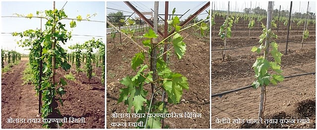 द्राक्ष बागेमध्ये रिकट घेतल्यानंतर नवीन फूट निघायला सुरुवात होईल. वाढत्या तापमानात पाणी उपलब्ध असल्यास फुटींची वाढ जोमात होताना दिसून येईल. काही ठिकाणी ही वाढ पाण्याची उपलब्धता किंवा जमिनीचा प्रकार (हलकी जमीन) यामुळे कमी राहील. खोड तयार होण्याकरिता फुटीची वाढ जितकी जोमात होईल, तितके फायद्याचे. यासाठी बागेत पाणी वाफसा स्थितीत राहील, असे नियोजन करावे. तापमान वाढत असलेल्या परिस्थितीत साधारण १ मि.मी. बाष्पीभवनाकरिता सुमारे ४२०० लिटर प्रति हेक्टर प्रति दिवस या प्रमाणात पाणी देण्याची शिफारस असते. बाष्पीभवनाच्या प्रमाणात योग्य तितके पाणी दिल्यास जमीन वाफसा स्थितीत राहील. मुळांची वाढही चांगली होईल. जर आपल्याकडे पाण्याची उपलब्धता कमी असल्यास दुपारी (जास्त तापमानात) पाणी देण्याचे टाळावे. शक्यतो सकाळी किंवा संध्याकाळी पाणी दिल्यास मुळांच्या कक्षेत चांगले पसरेल. वेलीस व्यवस्थित उपलब्ध होईल. आपण सामान्यतः ठिबक नळ्या जमिनीपासून काही उंचीवर बांधलेल्या असतात. मात्र डोंगराळ भागात किंवा उंचावर बाग असल्यास जास्त वाहणाऱ्या वाऱ्यामुळे ठिबकचे पाणी एका ठिकाणी पडत नाही. अनेक वेळा मुळांच्या कक्षेपर्यंतही पाणी पोहोचत नाही. अशा वेळी फुटीची वाढ जोमात होणार नाही. त्यासाठी ठिबक नळ्या जमिनीवर ठेवून घ्याव्यात. यासोबत मल्चिंगचा वापर करावा. यामुळे पाण्याची बचत होऊन, मुळांच्या कक्षेत ओलावा राहील. पुरेशा पाणी व्यवस्थापनाप्रमाणेच अन्नद्रव्याचा वापरही तितकाच महत्त्वाचा असेल. अन्नद्रव्यांपैकी नत्राचा वापर या वेळी महत्त्वाचा असतो. नत्रयुक्त खतांमध्ये युरिया, अमोनिअम सल्फेट, १२-६१-०, १८-४६-० इ. वापरता येईल. या वेळी शक्यतो पालाशयुक्त ग्रेड किंवा फक्त पालाश असलेल्या खतांचा वापर टाळावा. वाढ जोमात झाल्यास ओलांडा तयार करण्यासाठी ज्या ठिकाणी शेंडा खुडला जातो, तिथपर्यंत पेऱ्यातील अंतर वाढलेले असावे. ओलांडा तयार करण्यासाठी काप घेतल्यानंतर किंवा शेंडा खुडल्यानंतर त्यापासून निघालेली फूट काही काळ हळूवार चालताना आढळते. बगलफूट निघत असताना पाणी व नत्र दोन्हींची आवश्यकता असेल. ओलांड्याकरिता वळविलेल्या फुटीची वाढ जोमात असणे गरजेचे आहे. खोड तयार होते वेळी वाढीचा जितका जोम होता, त्यापेक्षा जास्त जोम या वेळी आवश्यक आहे. दोन पेऱ्यांतील अंतर साधारणतः २.५ ते ३ इंच असावे. आता तयार झालेला ओलांडा वेलीच्या संपूर्ण आयुष्यभर (१२ ते १४ वर्षे) पुरणार आहे. पुढील काळात प्रत्येक हंगामात रोगनियंत्रण आणि कॅनॉपी व्यवस्थापन यांचा संबंध लक्षात घेता या वेळी ही वाढ जोमात करून घेणे गरजेचे आहे. ओलांडा दोन टप्प्यांत तयार करण्याचा प्रयत्न असावा. १) पहिला टप्पा हा ८ ते ९ डोळ्यांच्या अवस्थेत म्हणजेच सहा 