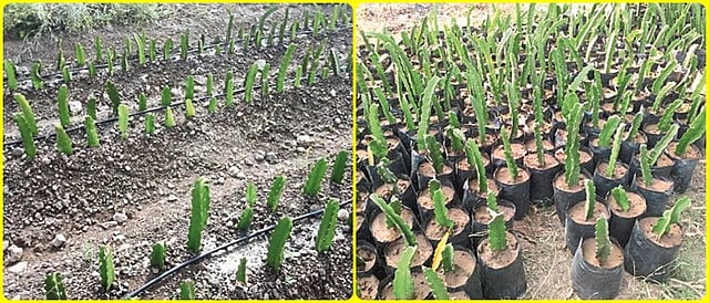 ड्रॅगन फ्रूटची झाडे बियांद्वारे किंवा कटींगद्वारे तयार केली जातात. कटींगद्वारे अतिशय जलद गतीने व सोप्या पद्धतीने रोपे तयार केली जातात. एक वर्ष जुनी गडद हिरव्या रंगाची फांदी निवडावी. हलक्या हिरव्या रंगाच्या फांद्यांना फुटवे थोडेसे उशिरा लागतात. २० ते २५ सेंमी लांब आणि ५ ते ६ सेंमी जाडीची फांदी रोपे तयार करण्यासाठी निवडावी. यापेक्षा लहान फांद्या सुद्धा वापरल्या जाऊ शकतात परंतु जर रोपवाटिकेमध्ये खोड कूज रोगाचा प्रादुर्भाव झाला तर, लहान फांद्या पूर्णपणे काढून फेकून द्याव्या लागतात. योग्य लांबीच्या फांद्या वापरल्याने अधिक फुटवा व मुळांची वाढ चांगली होऊन उत्तम गुणवत्तेची रोपे मिळतात. फांदीवर कोणत्याही प्रकारच्या रोगाची लक्षणे नसावीत, जेणे करून नवीन बागेमध्ये रोगांचे संक्रमण होणार नाही याची खबरदारी घेता येते. निवडलेल्या फांद्या ४ ते ५ दिवसांकरिता सावलीमध्ये सुकण्यासाठी ठेवल्याने कॅलसिंग व्यवस्थित होऊन रोगांचा प्रादुर्भाव होत नाही. रोपवाटिकेत फांदी लावण्यापूर्वी बुरशीनाशक (कार्बेन्डाझिम २ ग्रॅम प्रति लिटर पाणी) द्रावणात बुडवावी. रोपवाटिकेमध्ये पॉलिथिनच्या पिशवीमध्ये (१०x२५ सेंमी आकार) खत, माती मिश्रण भरून त्यामध्ये फांदी लावावी.गादी वाफा तयार करून त्यावर फांद्यांचे रोपण करून रोपनिर्मिती करता येते. रोपे बनवण्यासाठी ३ फूट रुंद आणि ०.५-१ फूट उंच गादी वाफा तयार करावा. यामध्ये शेणखत मिसळावे. ठिबक सिंचनाची लॅटरल टाकावी. गादी वाफ्यावर १५ ते २० सेंमीच्या अंतरावर फांद्या (कटिंग) लावाव्यात. नियमित अंतराने पाणी देत राहावे. गादी वाफ्यावर फांद्या लावल्याने मेहनत कमी होते त्याबरोबर खर्च ही वाचतो. अशाप्रकारे, तयार रोपांचे १.५ ते २ महिन्यानंतर मुख्य जागी पुनर्रोपण करता येते. रोपे तयार करण्याची जागा निवडताना जमिनीवर पाणी साठणार नाही याची काळजी घ्यावी. तसेच जिथे थोडीफार सावली असेल (२० ते ३० टक्के ) अशी जागा निवडली तर फायदेशीर ठरते. लावलेल्या फांद्यांना १५ ते २० दिवसामध्ये मुळे येतात आणि २० ते ३० दिवसांपासून फुटवे निघायला सुरवात होते. - विजयसिंह काकडे, ७३८७३५९४२६ (राष्ट्रीय अजैविक ताण व्यवस्थापन संस्था, बारामती, जि.पुणे )